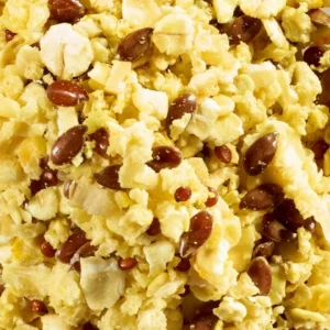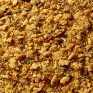 Avec des graines de lin, graines de quinoa rouge et flocons d’avoine. Goût légèrement torréfié après cuisson.
